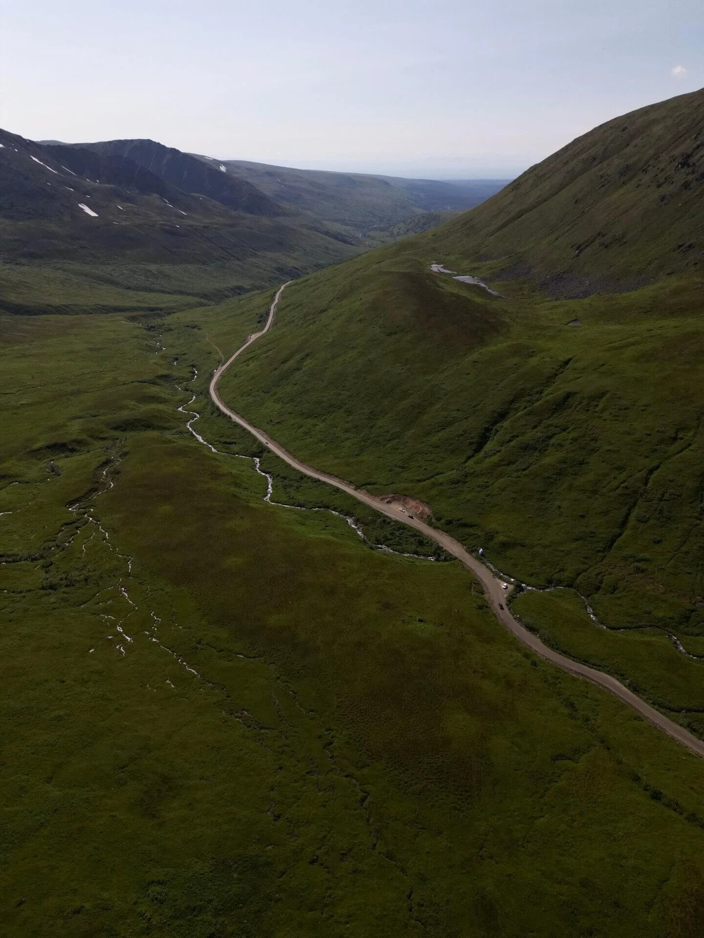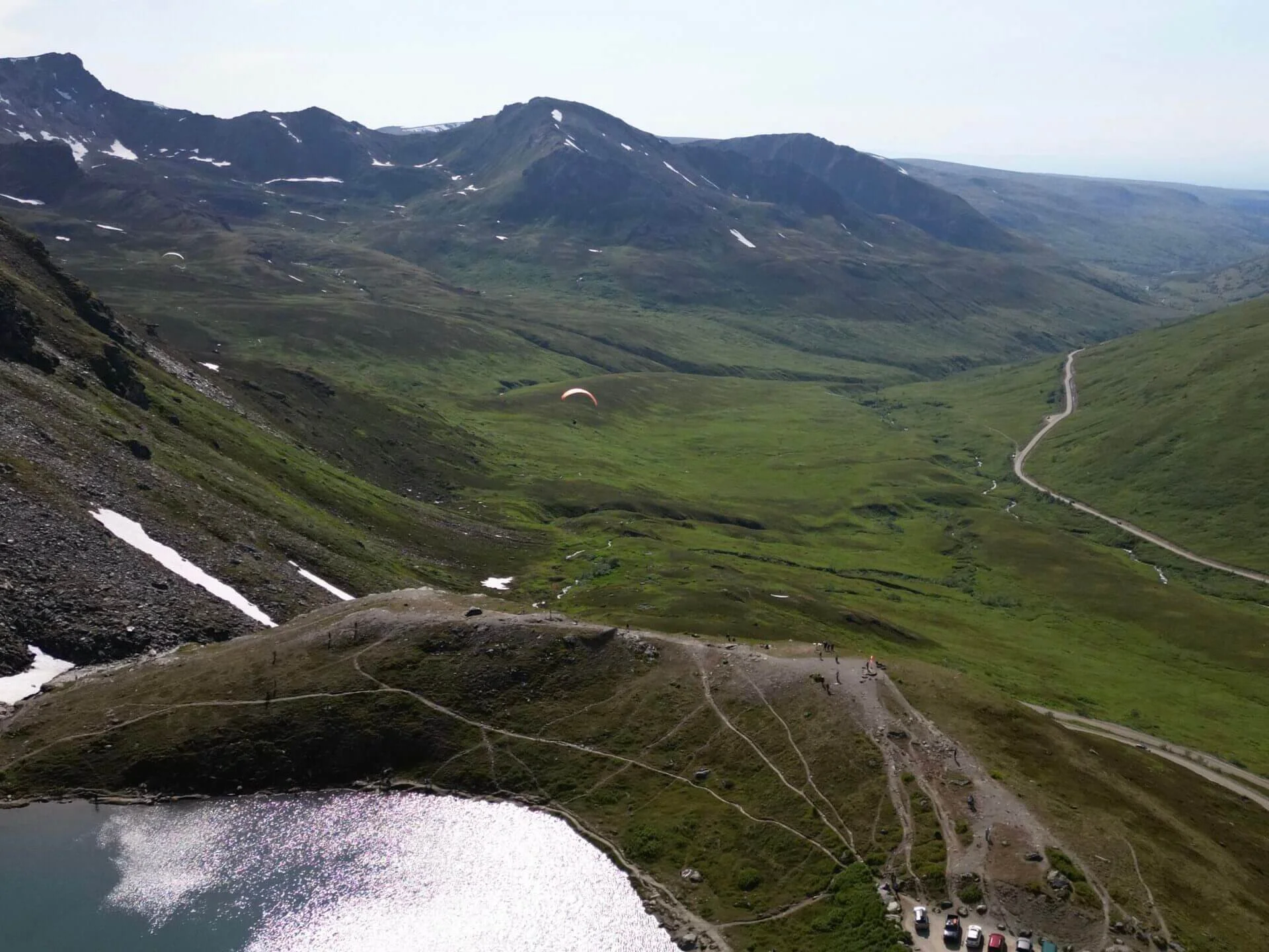 A popular stop along Hatcher Pass Road is Summit Lake, located just 15 minutes up the road from the lodge. This small, picturesque lake is surrounded by stunning mountain scenery. While the lake itself is beautiful, the main attraction in this area is paragliding. If you visit in the middle of summer, you’ll likely see paragliders soaring through the sky above.