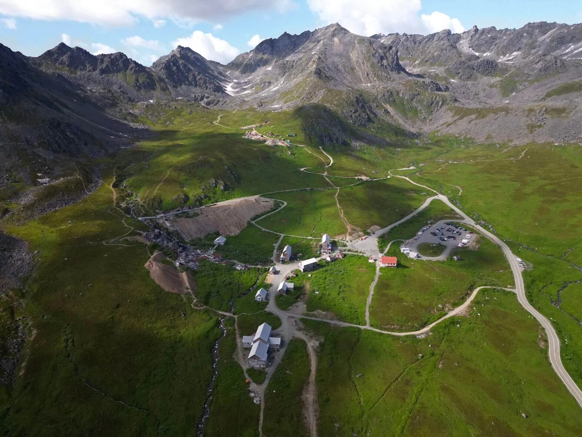 Right across from the lodge, you will notice Hatcher Pass Road winding up the hill into the mountains. This road stretches 49 miles through the Talkeetna Mountains and ends in the small town of Willow, located about 30 minutes north of Wasilla. You can start the drive from either Willow or Hatcher Pass. During the summer, the road provides access to some of the area's more remote wilderness. However, it is not maintained after snowfall, so much of it becomes inaccessible in the winter.